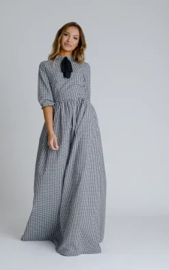 Luxury long dress with three-quarter sleeves and a classic pussybow collar. Perfect for Dinner Dance and formal nights out or family celebrations.